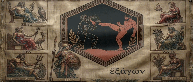 ATHENIAN PALAESTRA: Introduced at the Olympic Games of 648 BC, pankration (παγκράτιον: all-power) was the world’s first ‘mixed martial art’. In those elemental days of Olympians battling offensively and defensively with all their skill, the only forbidden unarmed combat techniques were eye-gouging and biting…. Thus it was, in contests dedicated to Athena, the Goddess of Wisdom, Craft, and War, that the greatest pankration athletes would compete in a six-sided arena: The Hexágōn (ἕξἀγών). The victor claimed the title of ‘Pantokrator’ (Παντοκράτωρ: all-powerful).