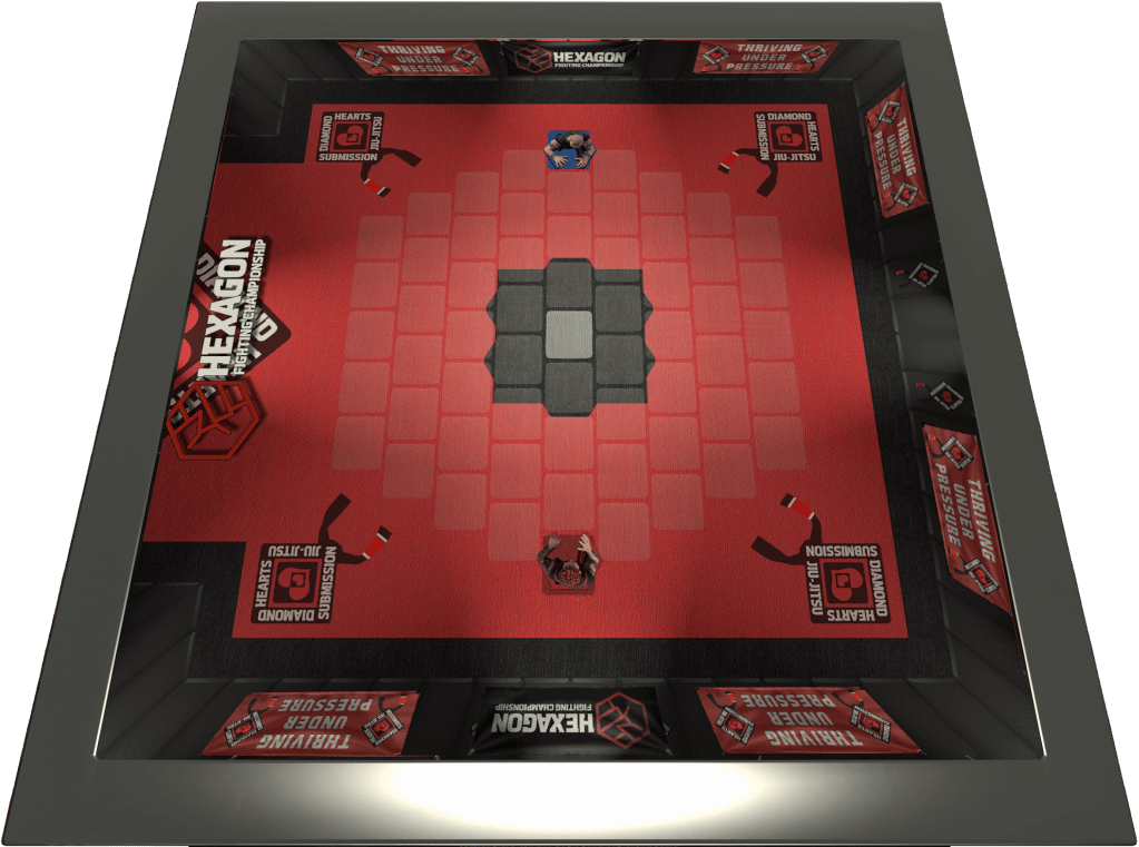SNAP, NAP, or TAP: At Diamond Hearts Submission Jiu-Jitsu, fighters train “The Gentle Art,” grappling with ♣️Takedown Shots, ♠️Throws&Trips, ♥️Chokes and ♦️Locks. No striking. ATTACKS with ♣️Takedown Shots from one or two hexes away score TOP CONTROL. ATTACKS with ♠️Throws&Trips from one hex away scores TOP CONTROL. DAMAGE is not calculated, so no chips are required. Only submission victory is possible. No ROUNDS, no time limit—do not reset fighters at the end of the deck, simply reshuffle and continue—first fighter to secure a ♥️Choke or ♦️Lock submission is the winner. UH, VAI MORRER!